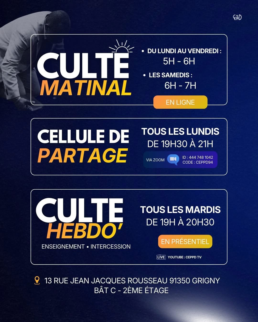 Visionnez l'intégralité des cultes hebdomadaires et dominicaux en direct ou en différé. Retrouvez des paroles encourageantes pour vous aider dans votre marche chrétienne. Les prédications et les chants de la chorale CEPPD vous aideront à vous approcher davantage de Dieu.